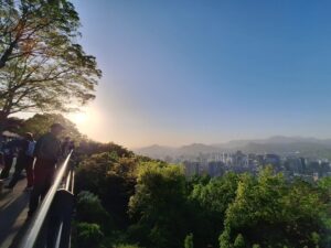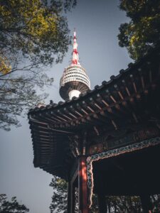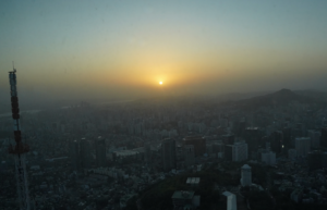 Punkt 16 Uhr löst sich die Spannung schließlich auf: Alle sind da. Ein kollektives Aufatmen, ein erstes Lächeln – und schon brechen wir auf zu unserer kleinen Auftaktfahrt mit dem Bus. Den ursprünglichen Plan, den Gyeongbok Palast zu besichtigen, verschieben wir angesichts dichten Verkehrs und zahlreicher Straßensperren wegen einer Demonstration auf das Ende unserer Reise. Stattdessen fahren wir zum N Seoul Tower, um den Sonnenuntergang einzufangen. Das „N“ im Namen steht zugleich für den Berg Namsan, auf dem er ruht, und für „New“ – ein leises Zeichen seiner Erneuerung seit 2005. Es ist ein zentrales Symbol für die Stadt Seoul und ein populäres Ausflugsziel.