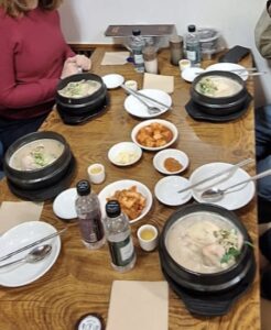 Zum Abschluss führt uns der Weg in das traditionsreiche Restaurant Tosokchon Samgyetang. Dort erwartet uns eine bekannte Spezialität des Landes: Samgyetang, das aromatische Ginseng-Hühnchen (삼계탕) – wärmend, kräftigend, ein erster kulinarischer Gruß aus Korea. Es ist eine Begegnung mit der Kreativität und Tiefe der koreanischen Küche.