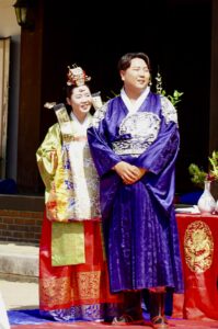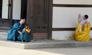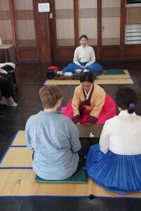 Heute erleben wir dort sogar das Ende einer traditionellen Hochzeit. Danach erhalten wir eine Einführung in die Kunst des koreanischen Teetrinkens, bei der auch Felix in die Zeremonie eingebunden wird – ein stilvoller Moment im stillen Zauber des alten Hanok-Hauses.