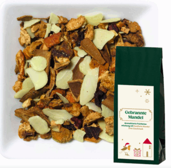 Aromatisierte Früchteemischung mit gebrannte Mandel-geschmack. Zutaten: Apfelstücke, Zimt, Hibiskusblüten, Mandeln gehobelt (15%), Rote Bete Stücke, Aroma.